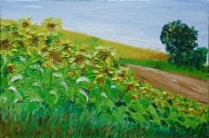 | | Sonnenblumenfeld bei Zaisenhausen 60 x 90, Öl auf Leinwand, 2011 (Kraichgau-Landschaften II) |